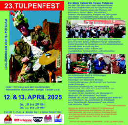 Über 160 niederländische Teilnehmer gestalten mit uns Brandenburgern dieses Fest. Handwerker, Musiker, Sänger, Tänzer und weitere Darsteller lassen niederländisches Lebensgefühl im Holländischen Viertel wahr werden. Veranstalter ist die COEX Veranstaltungs GmbH und Co. KG mit Unterstützung durch unseren Förderverein.